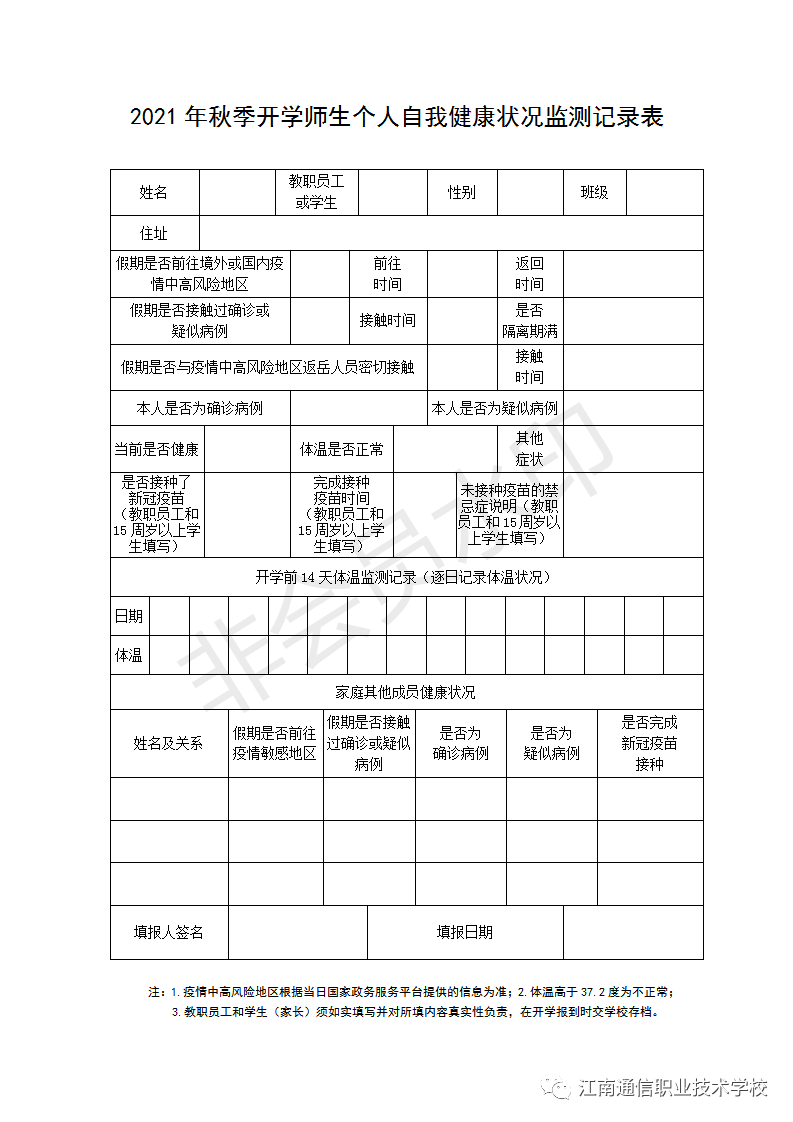 開學(xué)時(shí)請(qǐng)攜帶紙質(zhì)2021年秋季開學(xué)師生個(gè)人自我健康狀況監(jiān)測(cè)記錄表格上交學(xué)校。
